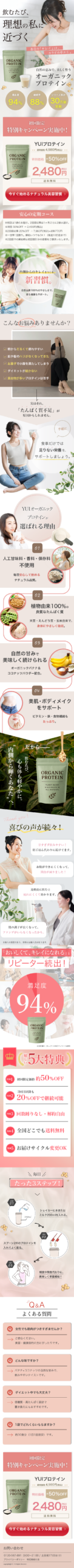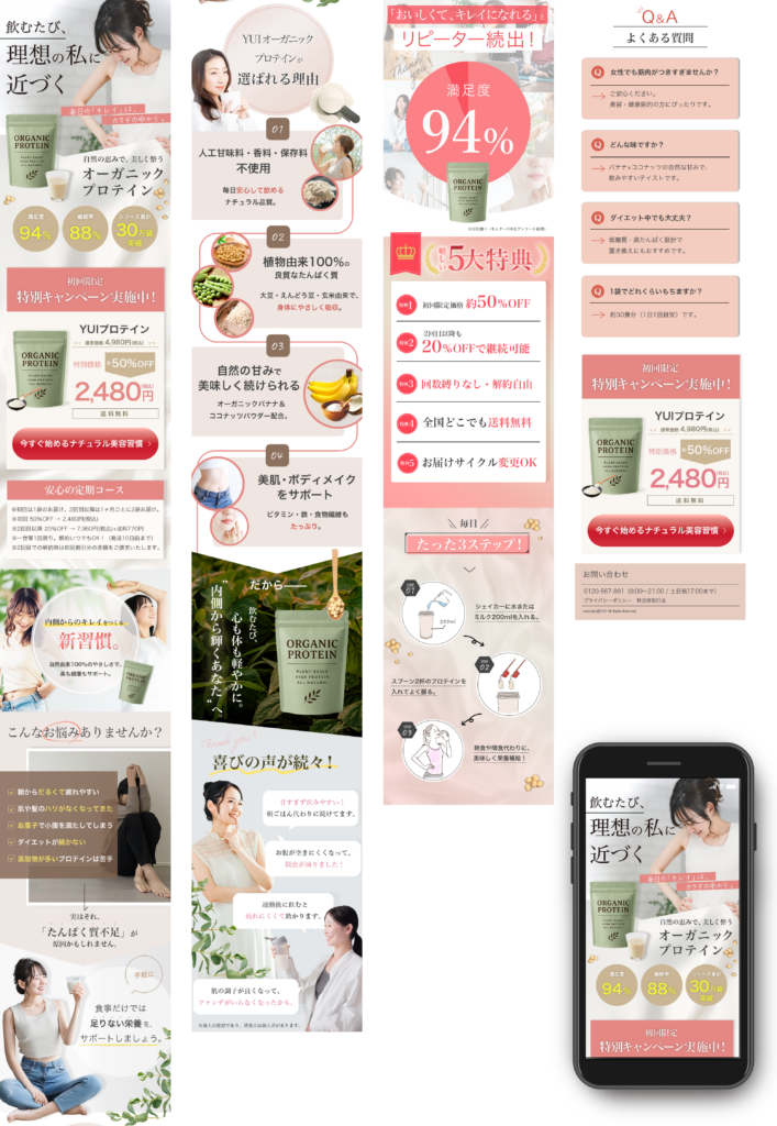 プロテインのサンプルLPを制作しました。20〜30代女性をターゲットに、ナチュラルさと信頼感が伝わる配色と構成を設計しています。情報量の多いLPでも離脱しにくいよう視線の流れを整理し、重要な情報が自然と目に入るレイアウトにしました。構成は、ファーストビューで「共感」と「理想の未来」を提示し、お悩み→安心材料→使用後の変化へと段階的に展開。納得感を積み重ねることで、自然に購入へつながる導線設計を意識しています。