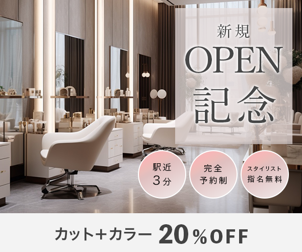 美容室のリニューアルオープンのサンプルバナーを、同一キャンペーン内容でターゲット別に2パターン制作しました。左側(スマホ:上部)は高級感を重視し、特別感のある体験を想起させるラグジュアリーな世界観に。右側(スマホ:下部)は明るく親しみやすい印象で、ファミリー層にも通いやすい雰囲気を表現しています。ターゲットに合わせて印象を設計することで、来店してほしい層へ的確にアプローチし、集客の精度向上を目的としたデザインです。